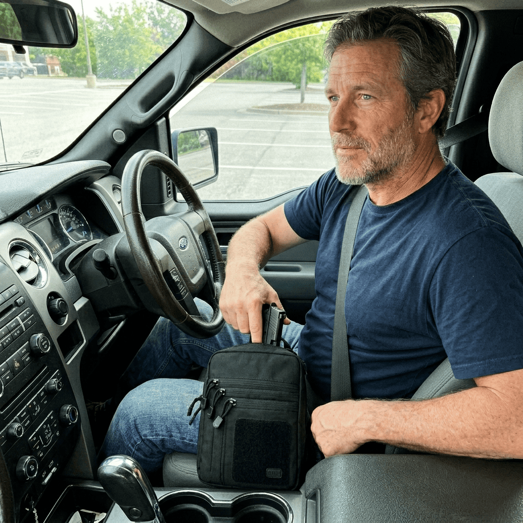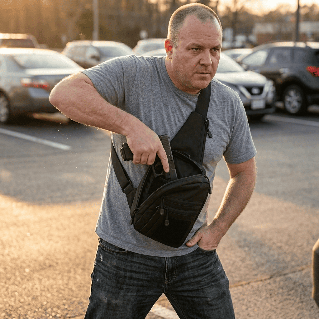 Walmart parking lot. School pickup. A walk through the city. The bag looks like any other sling pack. No MOLLE on the outside. No gun shape. No tactical branding.
